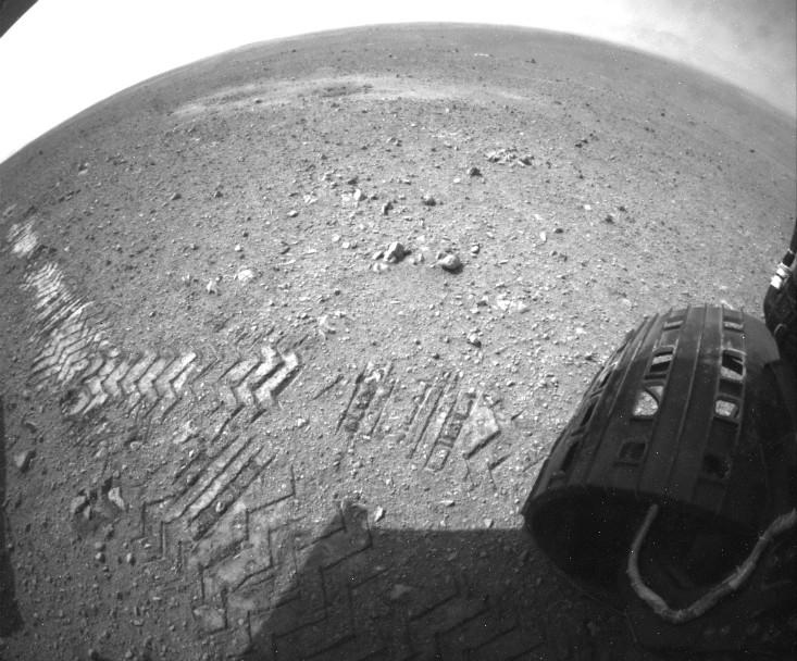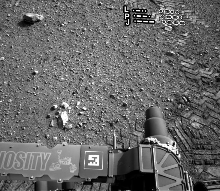 Every wheel rotation spells out JPL once. We have gone 3.9 kilometers [2.4 miles] so far on the surface of Mars. There are lots of instances of JPL across the surface.