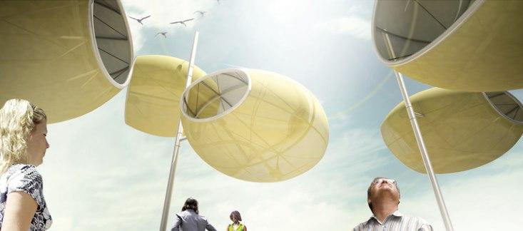 After four years of planning, WindNest has finally gotten the push from funders to begin prototyping what will be America’s first functional sculpture-slash-energy generator. The design of WindNest incorporates a small wind turbine held in a Teflon-fabric-and-fiberglass structure that has been tested in a wind tunnel for integrity. The fabric is extremely thin, which, combined with the pod-like design, makes WindNest look almost like blossoms on a stem. A third of the pod will also be covered in a photovoltaic material, allowing WindNest to generate approximately 150 MWh each year—about 20 homes-worth of electricity.