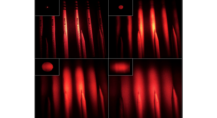 What we lost with the narrow illumination was a sense of depth. The whole scene was in focus, so that the pencil tips and erasers appeared to be located at the same distance from the viewer. The third dimension had not yet emerged. Using a lens and cardboard mask, Perry gradually enlarged the beam. The pencil tips remained in focus, but the erasers got blurrier. Illuminating a wider area of the film allowed the scene to be viewed from an increasing range of perspectives. The projection was developing some depth.
