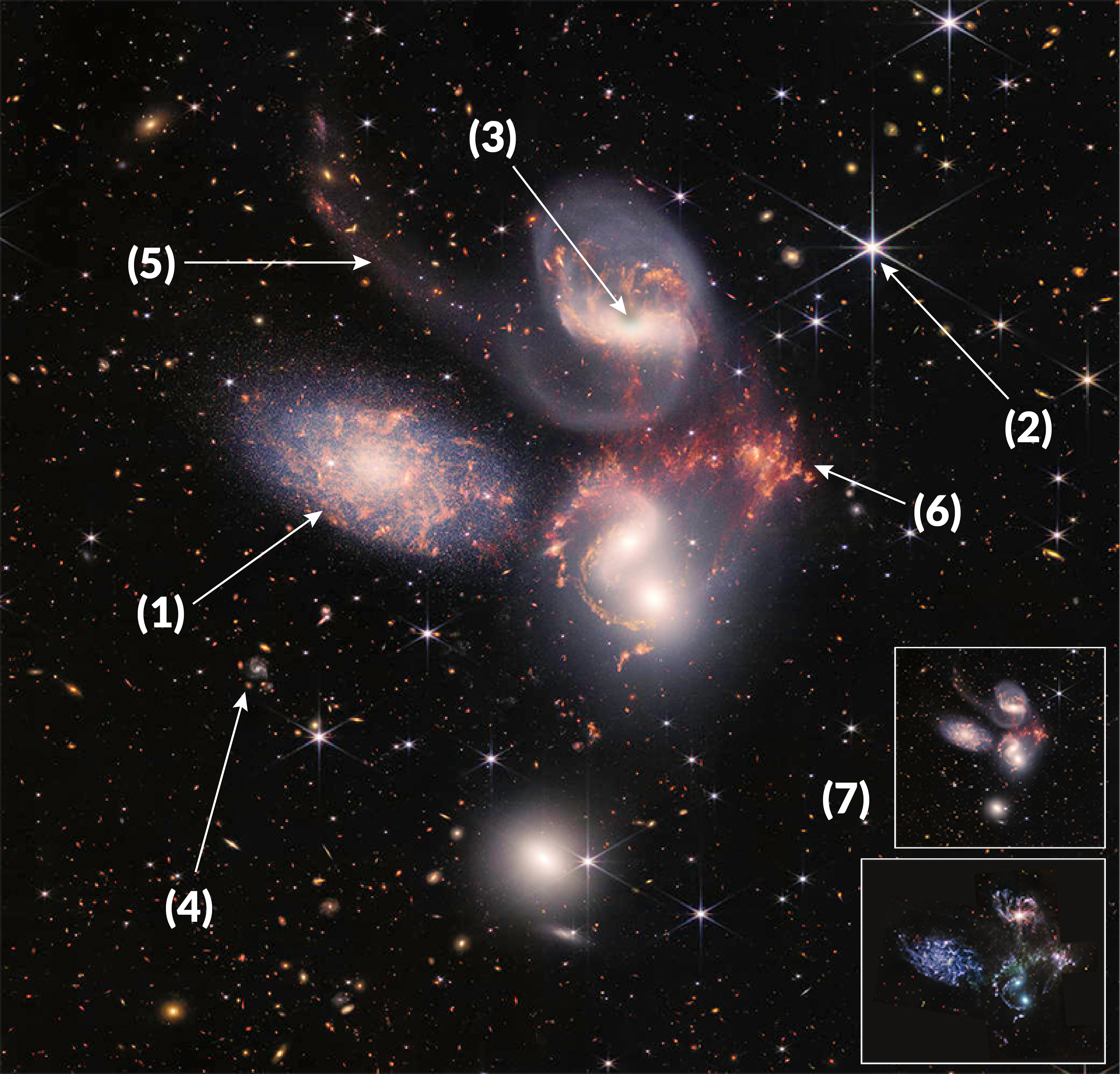 JWST’s images confirm how the rightmost four of these galaxies are bound together by gravity in a tight and vigorously interactive dance, where great streamers of billions of stars are being torn asunder, and huge bursts of star formation are being triggered as gas is disturbed. Ironically, these very interactions may be slowing the process of collapse toward a single giant galaxy, and for now Stephan’s Quintet balances on the cusp between that transformation and individuality. Like any good portrait there are nearly endless things to describe, but here are seven highlights that help us (and the universe) decode the scene.