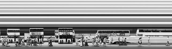 In his Urban Flow series, Magyar creates panoramas of crowded spaces and passing subway trains in Shanghai, Hong Kong, London, and New York. The settings are urban, so both crowds and passing trains are easy to come by. What’s unique in these images is Magyar’s application of a technique called slit-scan , in which, as the name suggests, a camera captures a scene as it moves in front of a thin slit. If the subject is moving at the same rate as the photosensitive film moving past the slit, the subject in motion looks crisp; if they move faster or slower than the film, what you’ll record is a blur.