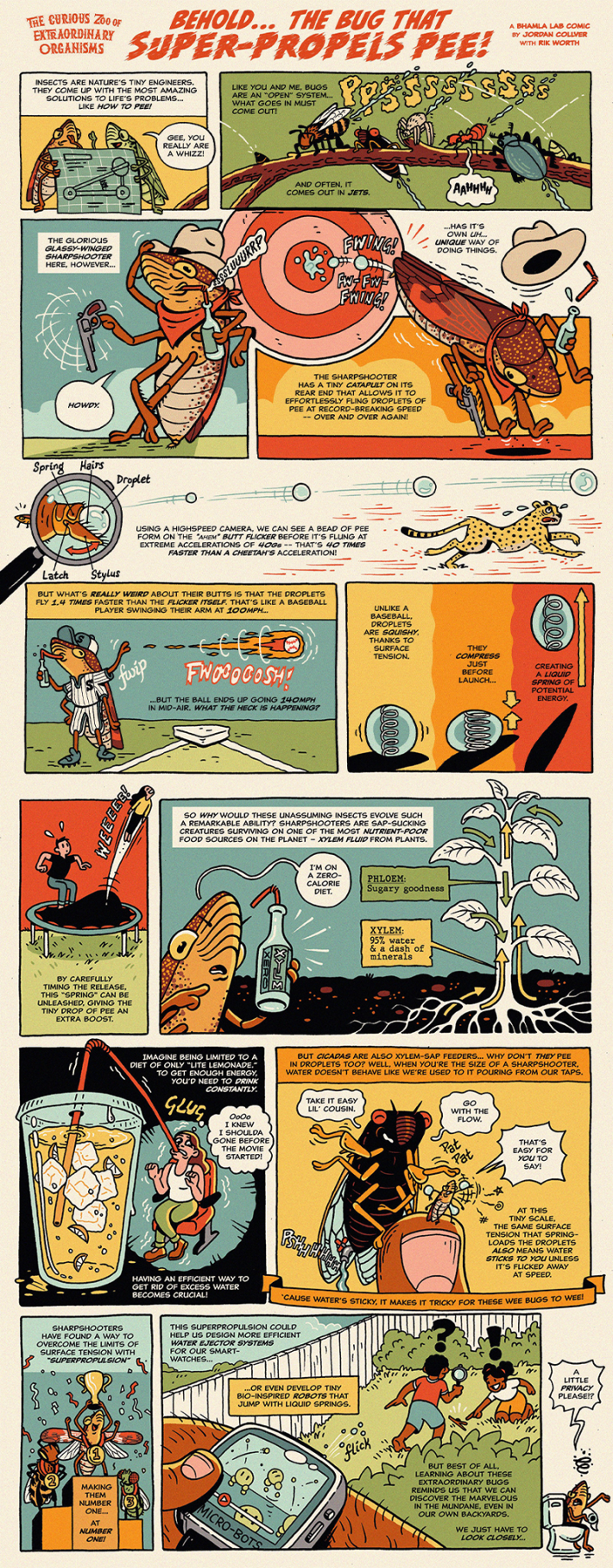 Not long ago, the Bhamla Lab at Georgia Tech University, a bioengineering research group, decided to investigate the sharpshooter and its extraordinary pee catapult. Turns out it’s an excellent model for energy-efficient water ejectors for things like smartwatches when water gets trapped inside. Below, a comic from Jordan Collver and Rik Worth about the sharpshooter’s super pissing powers.