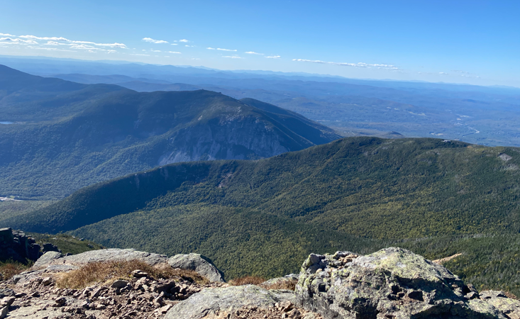 After a three-hour ascent along the Falling Waters Trail, my partner and I reached the peak of Little Haystack Mountain, the first of three summits along the trail. The sun was blasting, the wind was shoving us side to side and filling up the soundscape. We were hot in the sun, and cold in the wind. We were soaking in sweat from the arduous climb and shivering from the cold at the same time. We were hungry but almost too awestruck to eat. Only a cloud or two punctuated the clear sky. The horizon above the still-green mountaintops shone light azure but darkened into an ultramarine directly overhead.