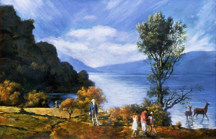In the 1990s, Russian-American artists Vitaly Komar and Alexander Melamid conducted a survey to determine the elements of a painting that Americans preferred and then painted a work that blended the elements. It featured a lot of blue—the sky, mountains, a lake—gentle brown woods, hikers, deer, and George Washington. They called the painting America’s Most Wanted. It had a satiric bite to it but the late art critic and philosopher Denis Dutton, in his book, The Art Instinct, wrote the painting shouldn’t be written off as worthless, “for it did reveal one stunning fact: People in very different cultures around the world gravitate toward the same general type of pictorial representation: a landscape with trees and open area, water, human figures, and animals.” And George Washington.