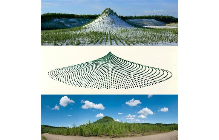 In 1996 Agnes Denes, a pioneer of the ecological-art movement, sent a bold message in a suitably bold form. She arranged 11,000 people to plant 11,000 silver fir trees on a hill made over a reclaimed gravel pit near Ylöjärvi, Finland. Sponsored by the United Nations Environment Program and the Finnish Ministry of the Environment, Tree Mountain is now a protected space to be maintained for generations. Denes’ artist’s statement reads: