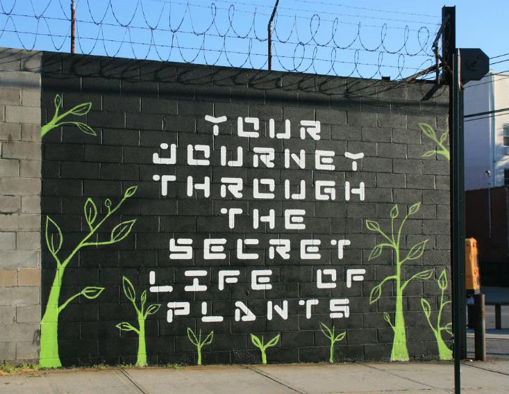 On a wall facing the Two Coves Community Garden and the Astoria Housing Development in Queens, New York, ecological street artists Fekner and Don Leicht painted a revamped version of the cover of Stevie Wonder’s 1979 album, Journey Through The Secret Life of Plants. In urban areas like this, growth comes between cracks in the sidewalk and blooms in ditches near train tracks and highways. The artists illuminate the environment’s scrappy ability to adapt and sustain. This project, reads Fekner’s description, “is an affirmation of hope and strength that Mother Nature will prevail whether it is a single plant species on a city street or an entire ecosystem threatened by man’s destructive ways.”