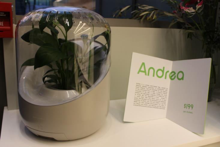 Other novel products lining the shelves of the café include Andrea, a plant-based filter system developed by Edwards and designer Mathieu Lehanneur. The device cleans the air faster than plants alone by way of a fan drawing air in and passing it across all parts of the plant—leaves, soil, roots—to more effectively trap and metabolize harmful toxins, before recirculating the air back into the room.