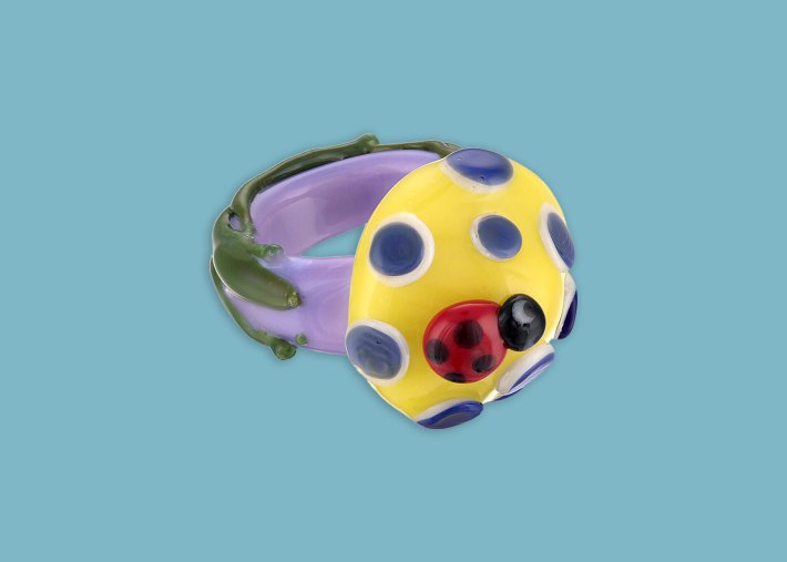 The ring Lalonde designed is her unique take on a mushroom species. Keeping in the tradition of her other work, this ring is a “souvenir” from her own fantasy world, informed by nature but fused with a sense of whimsy and play. Made by hand, the borosilicate glass ring is a hybrid of the imaginary and the real. The purple stem and yellow cap look almost like candy, an effect that plays on both the edible nature of many mushrooms, as well as a larger theme of synthetic tension that runs throughout the Beepy Bella catalog. Lalonde creates “childlike objects with sophisticated materials,” the combination of which sets up a relationship between curiosity and constraint. Sitting atop the mushroom ring’s cap is one of Lalonde’s signature emissaries, a ladybug.