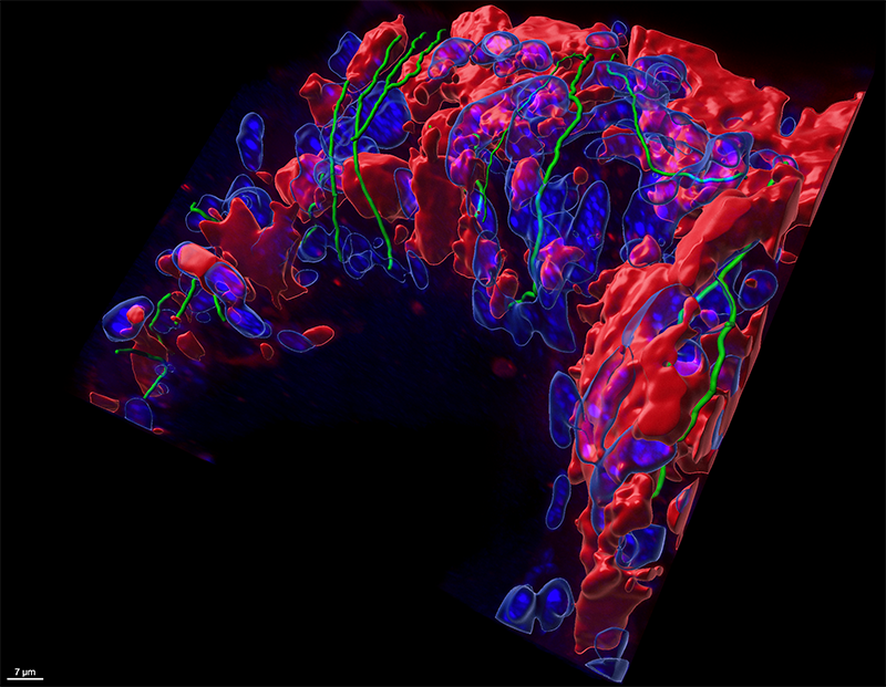With these technologies, mice can be engineered in such a way that whenever a tumor naturally grows in them, it fluoresces in, for instance, the color red. “That means that any descendants of those cancerous cells will also glow red wherever they go,” Trotman explains, which gives researchers a way to see how metastases spread and take hold. Similarly, mice can be engineered to have organs innervated by nerves of shimmering green or some other hue. That gives researchers an unprecedented opportunity to see how nerves and tumors play together. “With these tools we can label all the nerves that are innervating a particular organ,” Trotman says. “And then we can see the green nerves and the red tumor cells, and how they interact.”