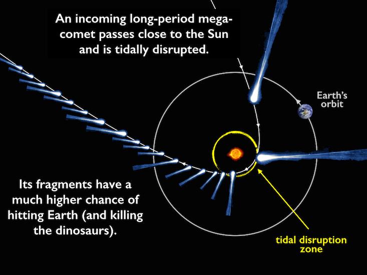 Asteroids large enough to kill the dinosaurs have been shown to hit Earth about once every 350 million years. Without accounting for tidal disruption, long-period comets have such low impact probabilities that only one dinosaur killer would have struck Earth since its formation. However, after taking disruption into account, Siraj and Loeb find that the rate of such impacts is about the same as for asteroids. The same process would not boost the impact rate of asteroids, however, because asteroids are too dense to easily disrupt.