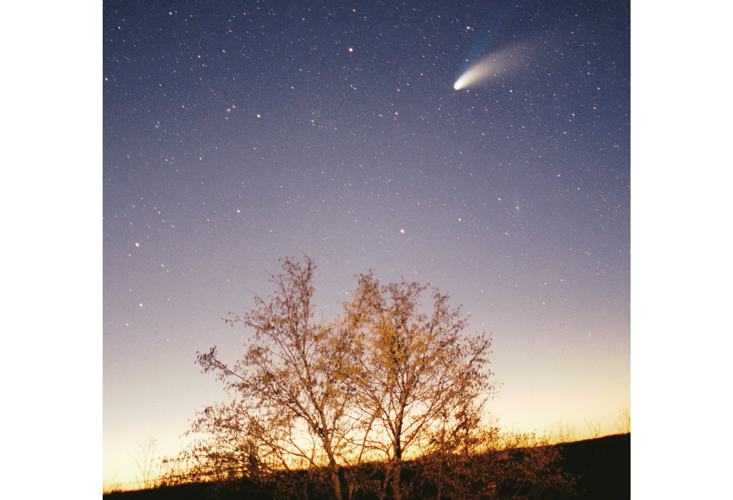 Long-period comets are the least likely to hit our planet because they visit the inner solar system rarely (often just once) and zip by so quickly that the Earth is a tiny target. They originate in the Oort cloud, which extends several light-years from the sun (out to 200,000 times the Earth-sun distance) to the edge of the solar system. Most objects from the Oort cloud will never pass close to the sun, but the few that do can light up our skies. As they warm up and their ices vaporize, they create bright comae and tails. Comet Hale-Bopp was a dazzling sight when it passed through the inner solar system in 1997.