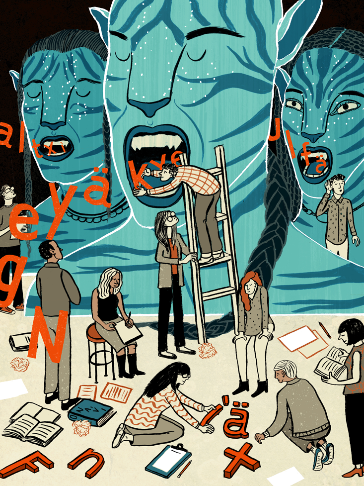Littauer and other Na’vi fans realized that the first step in the language game was to transcribe each line of Avatar’s Na’vi dialogue and try to match each spoken word to the English subtitles. This was a painstaking task, as Na’vi has phonemes rarely heard in English or Romance languages—like ejectives and sounds like “rr” and “ll,” which function as vowels, and familiar consonants in unusual places, like “ng” at the start of words. Learning Na’vi, they discovered, was like being an anthropologist dropped into a remote Amazonian tribe, armed only with a few snippets of the local language that had been transcribed, possibly incorrectly.