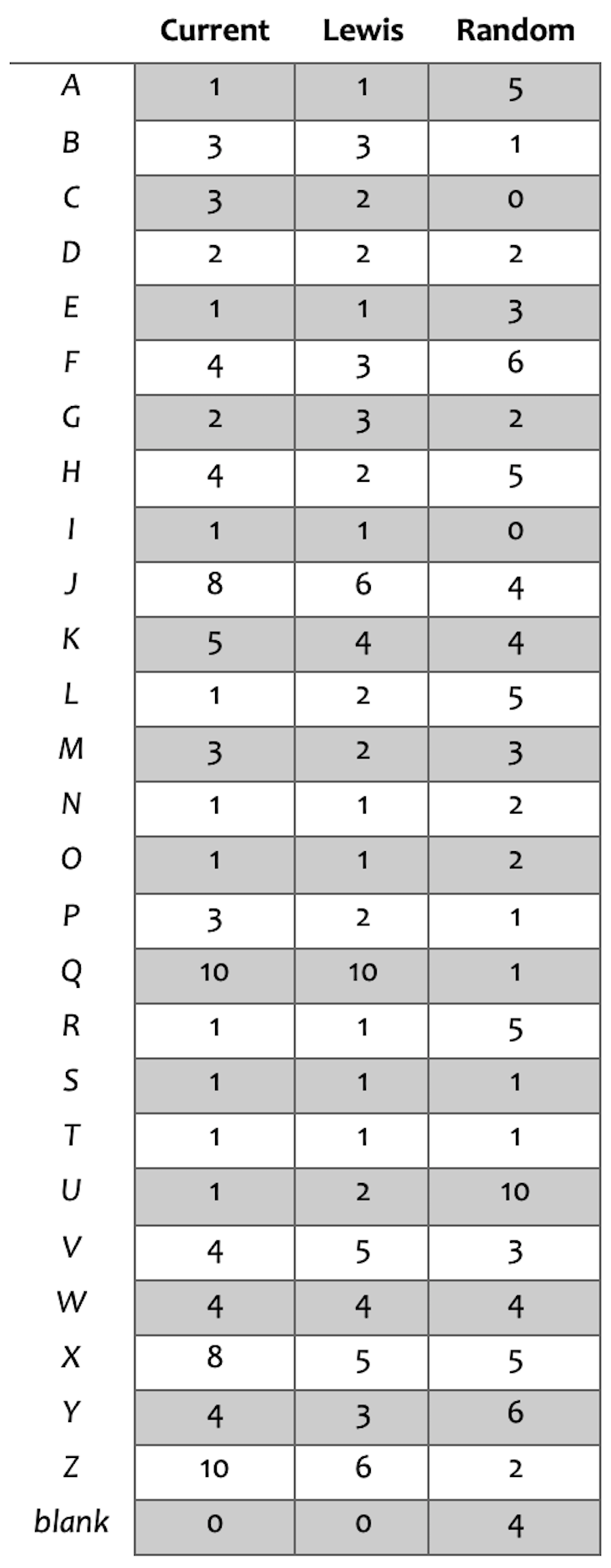 Recently, I conducted my own tests to see if Lewis’ values really make Scrabble more fair. In short, Lewis was wrong. His values don’t reduce the element of luck in Scrabble. The tests also show, however, that traditional tile scoring isn’t more fair than random tile values. If we want to make Scrabble scoring more indicative of skill, we’ve been looking at the wrong part of the game for years.