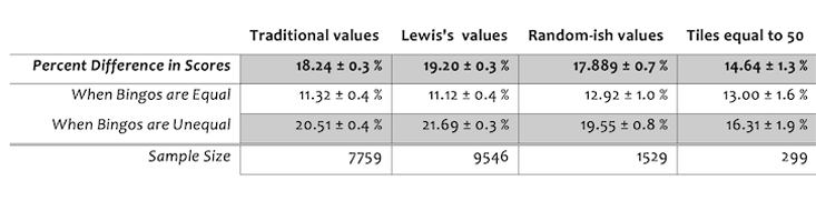 If we devalue the bingo by setting all tiles equal to 50, the average percent difference falls to 14 percent. Furthermore, when players earn an equal number of bingos, the percent differences in scores for all different kinds of tile distributions—the traditional values, Lewis’ values, all tiles equal to 50, even random values—are roughly equal.