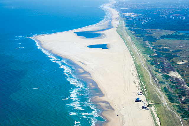 One experimental project in the Netherlands that is starting to catch on elsewhere is the Zandmotor, or Sand Engine—a 1-kilometer-long, hook-shaped sand peninsula that was built in 2011 along a stretch of coastline at Ter Heijde in South Holland. In a single operation 10 kilometers offshore, dredgers collected 21.5 million cubic meters of sand, which was then deposited in the designated area. Over time and by design, waves and tides slowly disperse the sand and naturally replenish nearby beaches. This conceptually simple experiment, also known as sandscaping, has performed as designed, preventing beach erosion. It has also been more efficient and economical, as well as less disruptive to the beach and to wildlife ecology, than a traditional approach such as regular sand replenishment. Its success has not gone unnoticed; another sand engine is now, with Dutch help, being constructed along the North Sea coast in Norfolk, England, an area where severe beach erosion threatens coastal towns and industry.