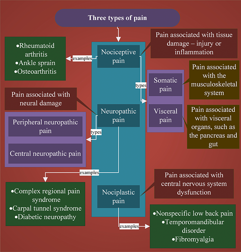 When most of us think of pain, it is what physicians and neurobiologists call “nociceptive pain,” typically the result of tissue injury when a peripheral body part has been burned, crushed, punctured, or sliced. Nociceptive pain can also derive from visceral structures such as the heart, liver, or—more commonly—the gastrointestinal tract, which is highly sensitive to inappropriate stretching. Whereas peripheral nociceptive pain is generally sharp, that deriving from our viscera tends to feel dully persistent and, unsurprisingly, deep. Not to be ignored when it comes to nociception is inflammatory pain, evoked by arthritis and other excessive immune responses.