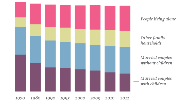 The surge of singlehood is not just an American phenomenon. Between 1980 and 2011, the number of one-person households worldwide more than doubled, from about 118 million to 277 million, and will rise to 334 million by 2020, according to Euromonitor International. More than a dozen countries, including Japan and several European nations, now have even larger proportions of solo-dwellers than the U.S. (Sweden ranks highest at almost 50 percent.)2 Individuals, not couples or clans or other social groups, are fast becoming the fundamental units of society.