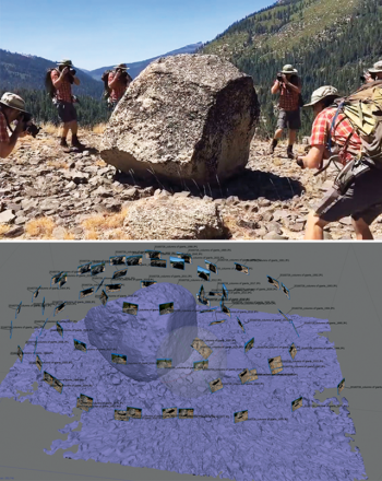 Lead image: A photosphere view of a glacial erratic featured in a virtual reality geology field trip to Columns of the Giants in the Sierra Nevada of California. Credit: Ryan Hollister.