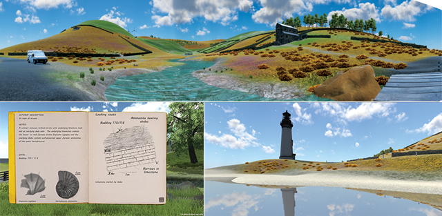 Houghton and her colleagues created a virtual, animated landscape of three field sites to render a three-dimensional version of the world where students could “walk” around in the landscape, like in a first-person video game. “The students get a blank map that shows topography, and they walk around and work out where they are,” noting rock types at different locations.