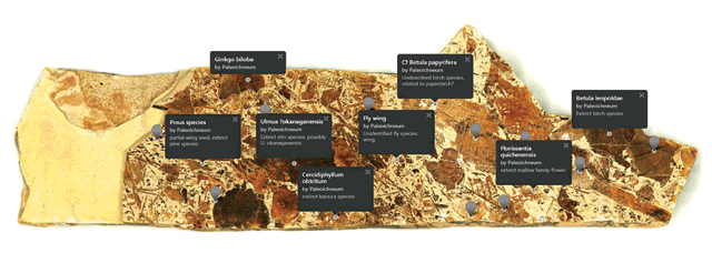 One example of an image available on GIGAmacro’s website is a slab of fossiliferous sedimentary rock from the Stonerose Interpretive Center and Eocene Fossil Site in Republic, Washington. This particular sample is chock full of fossils ranging from parts of insects to leaves, each of which was identified with virtual push pins by Stonerose scientists, who included as much detail about the remains as possible, allowing students to study the rock and fossils in minute detail.