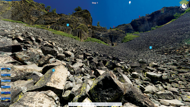Ryan spent the summer of 2016 photographing the field site. Even after the time-consuming field photography was done, learning the software programs to create the imagery took many nights and weekends during the school year. Ryan edited and stitched together the photos to create imagery for six separate “field stops” within the virtual tour of Columns of the Giants. The technology and methods take some expertise to utilize, Ryan says. “It’s not as plug and play as it could be,” though he adds that, once mastered, creating high-resolution images for virtual reality applications is relatively quick.