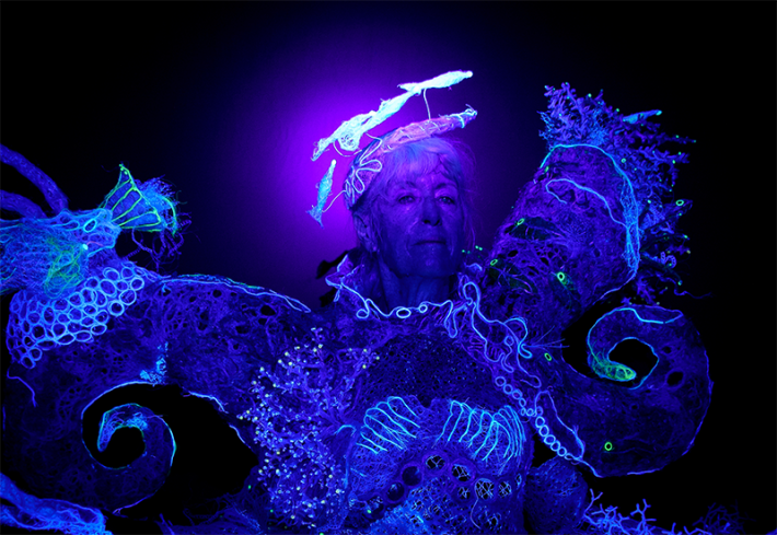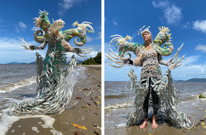 When Marion Gaemers and Lynnette Griffiths turned on the black lights in their studio not long ago, they were pleased. The discarded fishing gear they were using to create their latest work of art luminesced, giving it a ghostly oceanic glow. The wearable sculpture, which has 500 silvery sardines worked into its skirt, is meant to conjure an imaginary queen who lives beneath the sea—and to warn of the dangers of ghost nets.