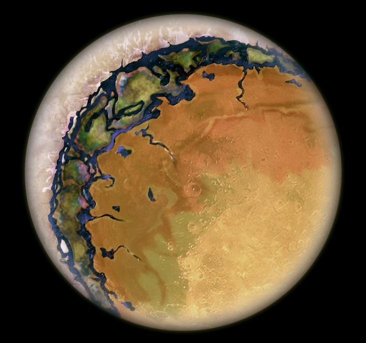 Where on a hot eyeball planet could you live? It’s a classic Goldilocks story. The day side is roasting and dry. The night side is frigid and icy. In between, it’s just right! The sweet spot—let’s call it the “ring of life”—is at the terminator, the boundary between night and day. The ring of life is bounded by deserts on one side and ice on the other. There is a constant flow of water from the night side to the day side—a series of rivers, all flowing in the same direction. The Sun is fixed in the sky right at the horizon, and the area is in permanent light. Conditions are pretty much the same all the way across the ring of life. One can imagine vegetation following the rivers onto the day side until they dry up, with different ecosystems interspersed along the way. There could be mountains at the edge of the ice sheets, since the ice-covered continents would be heavily weighed down.