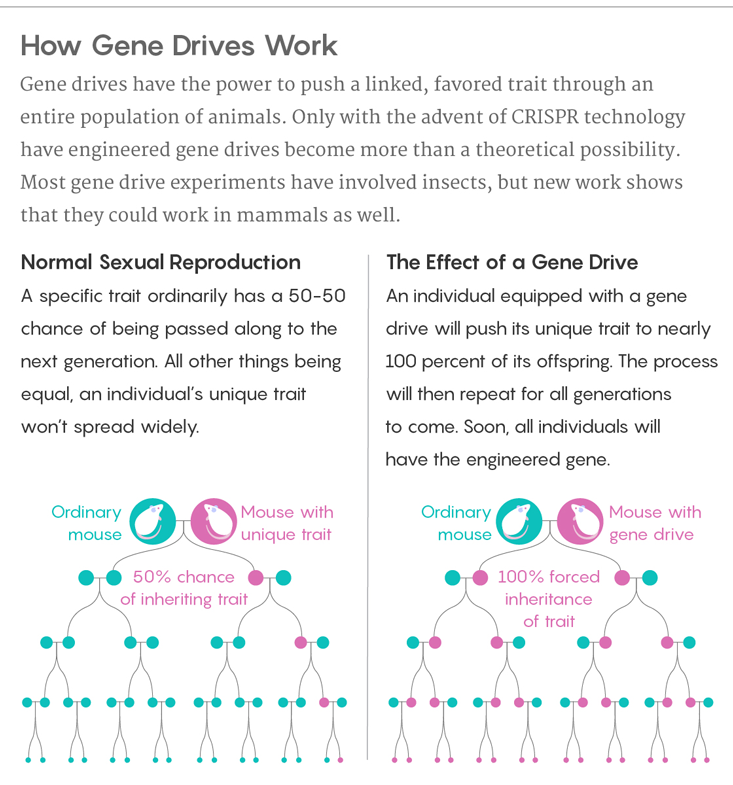 That has now changed. In a paper appearing this week in Nature, biologists at the University of California, San Diego demonstrate for the first time that current gene drive technology also works—at least up to a point—in a mammal: the mouse. Their findings highlight the potential, but also the significant limitations, of putting gene drives to work in the real world. For at least some time to come, these kinds of “active genetics” technologies may be more useful as laboratory tools than as instruments for remaking nature.