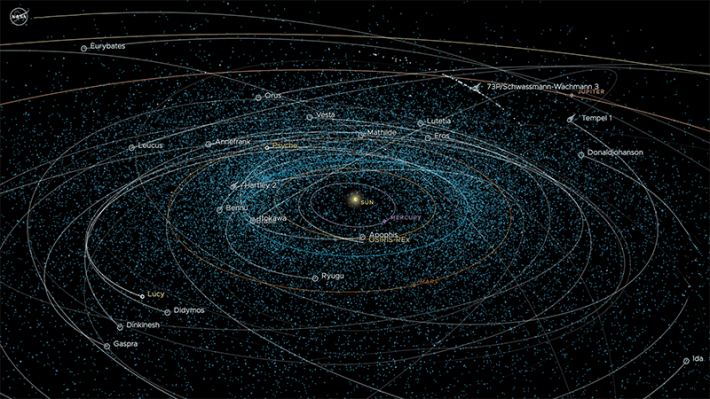 Currently, according to NASA, there are 1,351,594 known asteroids in our solar system. The number, detailed on an agency web page, increases slowly but regularly, like one of those “Days Since Last Accident” signs in a factory, as astronomers continue to pick them out of the heavens. The bulk of these “rocky, airless remnants,” as NASA terms them, are dispersed throughout what’s known as the “main asteroid belt,” the torus-shaped sea of ancient flotsam between Mars and Jupiter.