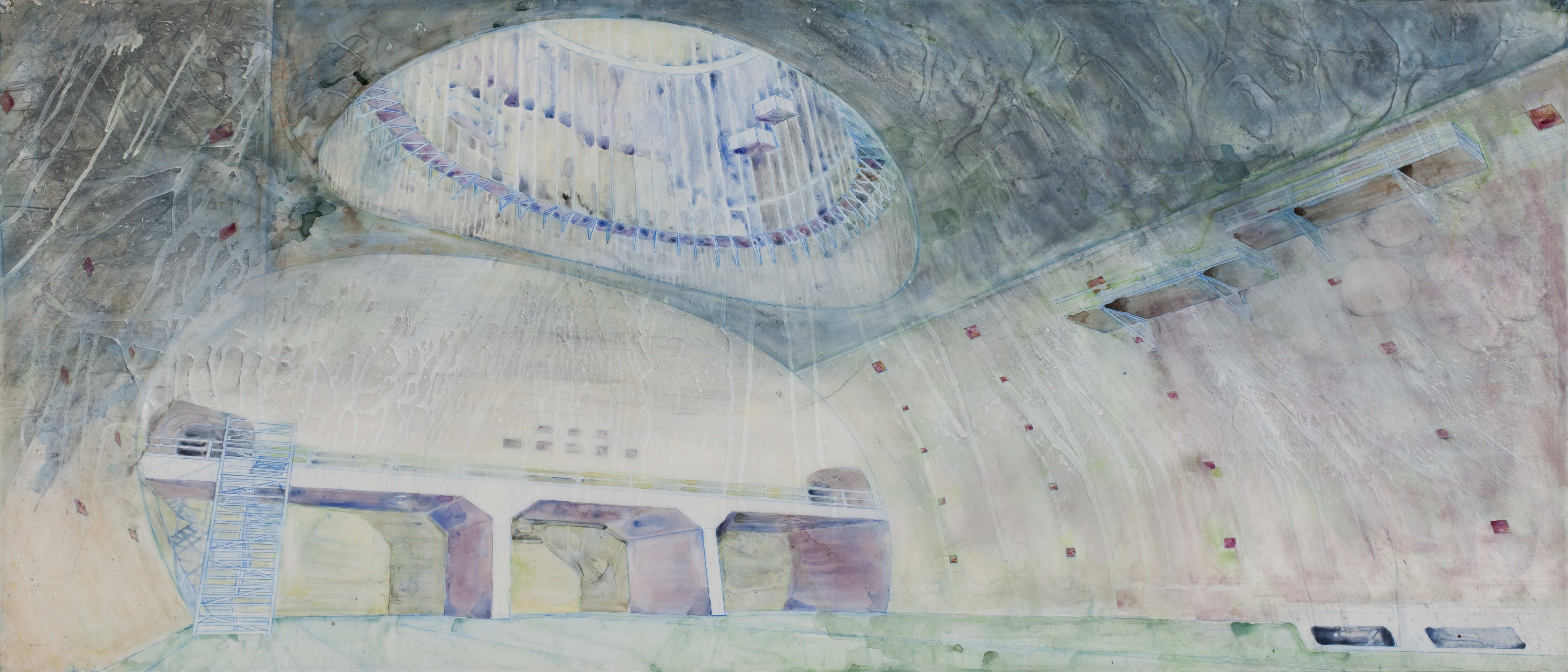 The pieces in the Large Hadron Collider series are painted on both sides of sheets of Mylar, a plastic-like material traditionally used for architectural drawings. On one side, Feldschuh made painstakingly precise drawings of the facility to represent the engineering prowess. On the reverse side, he made a splatter painting by dropping paint from a ladder onto the sheet. It represents the moment of impact when particles within the accelerator collide, reminding viewers of the machine’s goal to explore the unknown. Both sides of the Mylar sheets juxtapose the large with the small, a theme that can be seen within the collider itself since physicists had to build a huge particle accelerator to observe the lightest particles. In this way, Feldschuh transforms a complex scientific instrument into a statement about one of our greatest human endeavors.