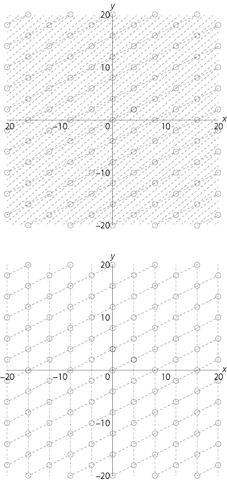 For example, if Alice wants to send Bob a message, she could identify it with a point in Bob’s n-dimensional grid and then add some “noise” to it by moving it off the grid a small amount. If n is very large and the angles in the grid are skewed—very far from right angles—it seems difficult for Eve the Eavesdropper to figure out Alice’s original point, and a quantum computer doesn’t seem to help much. But if Bob (and only Bob) has a different set of lines drawn through the same points, but with angles closer to 90 degrees, then he has a “trap door” which allows him to recover the point and the message. Variations on this idea are known as lattice-based cryptography, and are some of the front-runners for post-quantum use.