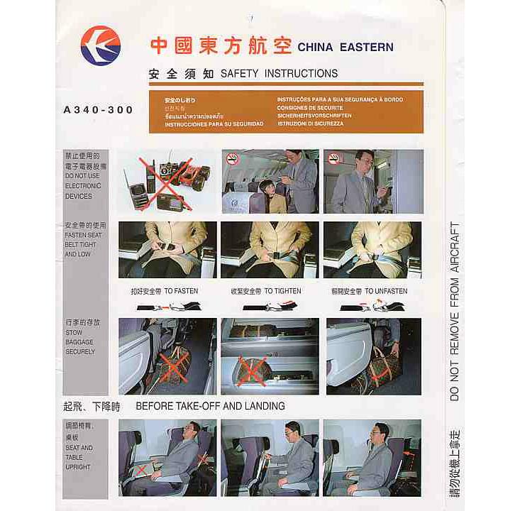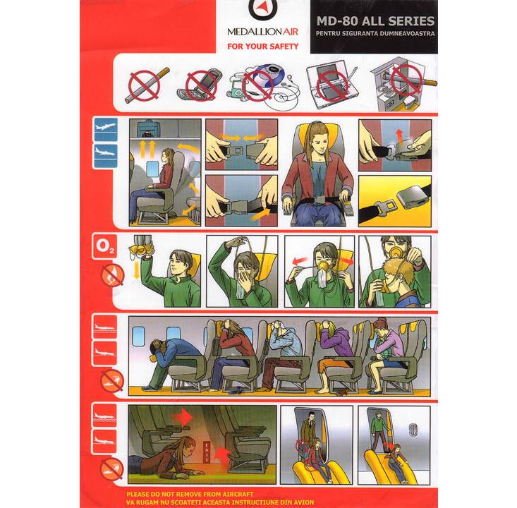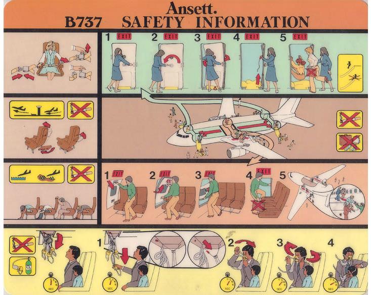 Nautilus: Surveys suggest that passengers do want their safety cards to remind them that safety is at hand. In the Australian Transportation Safety Bureau survey (pdf), one respondant explained that they liked a card in part because “[the] yellow or red indicates to me its safety.” Passengers also didn’t like it when the airplane depicted in the safety card didn’t look safe or robust. “The safety/exit door—it looked like it was convoluted,” complained one respondent.