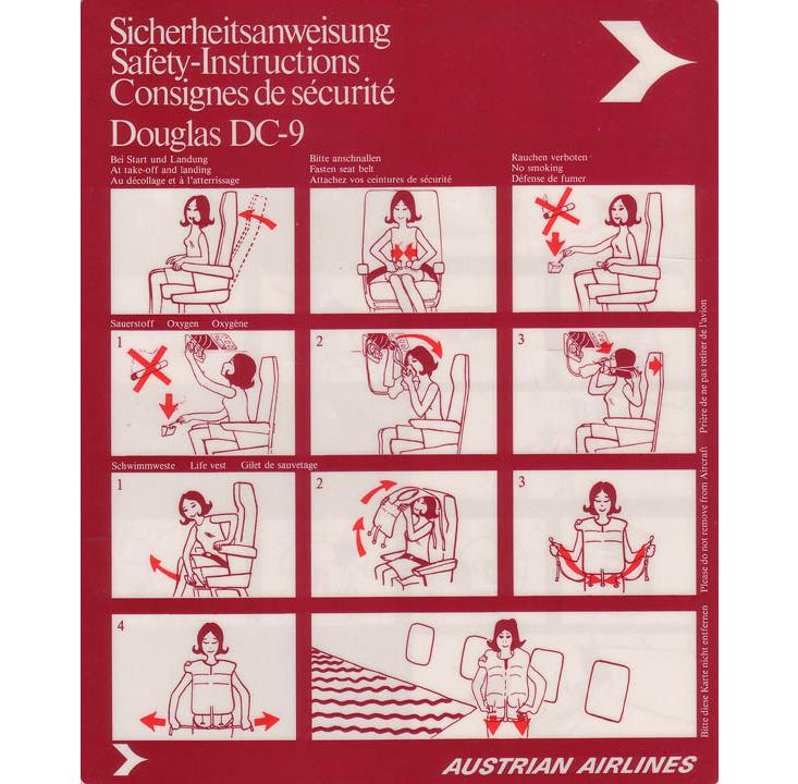 To help lower that risk still further, every time you get on the plane, you’re instructed how to fasten your seatbelt, to put on your oxygen mask, and to inflate your life vest. One of the last things you hear before taking to the skies is something like “You will find and all other safety information in the card located in the seat pocket in front of you.“ So do you actually study the card? What you’ll find is a not just a list of safety facts, but an unusual piece of media, designed to effectively convey information and instill a sense of potential urgency, while leaving the passenger free to calmly enjoy—or at least ride out—the much more likely possibility of an utterly average flight.