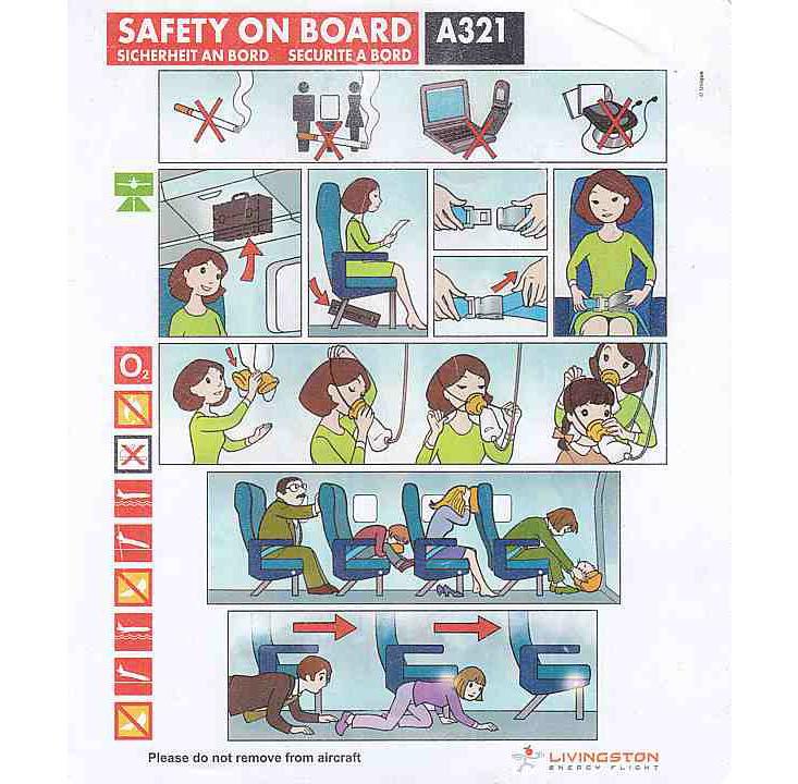 Moghadam: This is one of only a few examples of safety cards I’ve come across that opt for photography over illustration to visualize the procedures. It’s a shame that the photos don’t come off as professionally shot - you get the sense that an untrained photographer used a point-and-shoot camera with flash. Compositionally, the photos aren’t as great as they could be and more attention should have been paid to clearly describe these procedures visually.