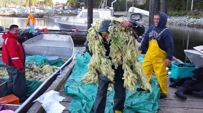 DECK THE BOUGHS: A traditional Coastal First Nations method of harvesting herring eggs involves sinking hemlock boughs tied to a floating line so that the fish spawn near the branches, their eggs attaching to the plant matter. Photo by Alejandro Frid.