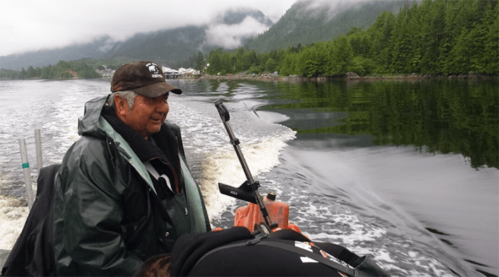 It is March of 2015, and I am on the central coast of British Columbia, Canada, accompanied by two members of the Kitasoo Xai’xais Nation: 71-year-old Charlie Mason, who is a Hereditary Chief also known as Neasmuutk Haimas, and his 10-year-old grandson, Dean Duncan. It’s 39 degrees Fahrenheit and raining hard. Exposed to the frigid downpour, we cruise along in Mason’s aluminum punt, our wake slapping against a rocky shoreline from which forested hills rise to become open mountaintops.