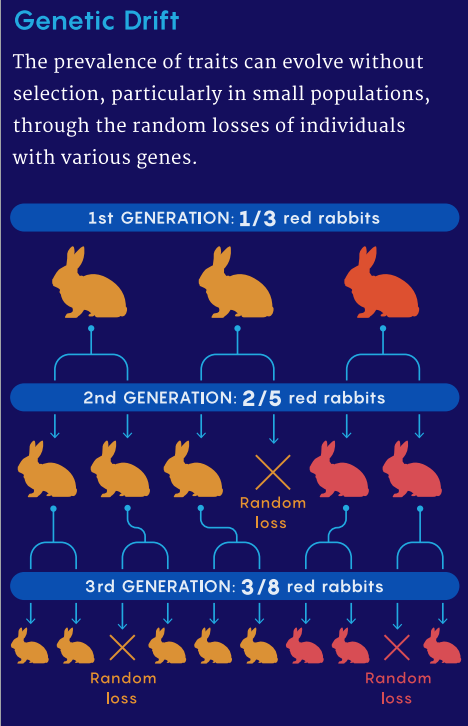 Imagine a population of 10 birds: one red, one green and all the rest brown. These colors aren’t harmful or helpful, so all the birds have the same chance of reproducing. Then a tornado kills six of the brown birds, purely by chance. Now half the population is brown, a quarter is red and a quarter is green. A random event caused a major shift in diversity. That’s genetic drift.
