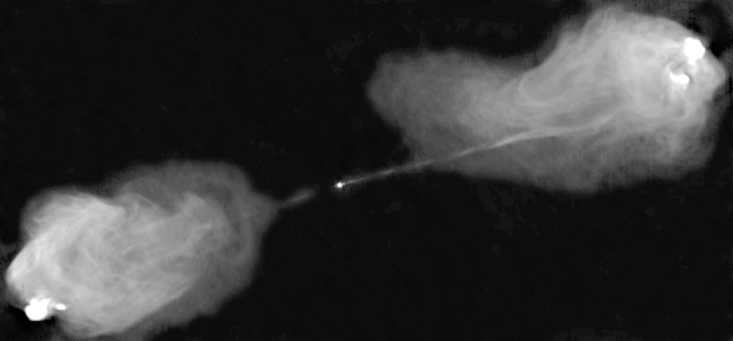 How did we come to this astonishing conclusion? The story begins in the mid-1900s when astronomers expanded their horizons beyond the very narrow range of wavelengths to which our eyes are sensitive. Very strong sources of radio waves were discovered and, when accurate positions were determined, many were found to be centered on distant galaxies. Shortly thereafter, radio antennas were linked together to greatly improve angular resolution. These new “interferometers” revealed a totally unexpected picture of the radio emission from galaxies—the radio waves did not appear to come from the galaxy itself, but from two huge “lobes” symmetrically placed about the galaxy. Figure One shows an example of such a “radio galaxy,” named Cygnus A. Radio lobes can be among the largest structures in the universe, upward of a hundred times the size of the galaxy itself.