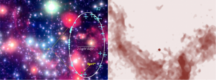 Meanwhile, the development of high-resolution infrared cameras revealed a dense cluster of stars at the center of the Milky Way. These stars cannot be seen at optical wavelengths, because visible light is totally absorbed by intervening dust. However, at infrared wavelengths 10 percent of their starlight makes its way to our telescopes, and astronomers have been measuring the positions of these stars for more than two decades. These observations culminated with the important discovery that stars are moving along elliptical paths, which are a unique characteristic of gravitational orbits. One of these stars has now been traced over a complete orbit, as shown in the left panel of Figure Two.