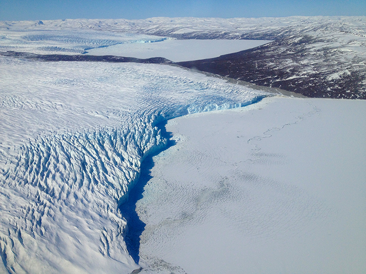 A low-flying airplane buzzes along the coast of Greenland, hovering over a glacier. The belly of the plane holds a laser that bounces light off the glacier’s face. As the light beam returns to the plane, it enters a black box that slows it to a crawl, turning it into a moment-by-moment report on the glacier’s speed. Each flight, each glacier measured, allows researchers to map the diminishment of the Greenland ice cap. Similar planes skirt Antarctica and the coast of Alaska, charting the damage to the ice cover.