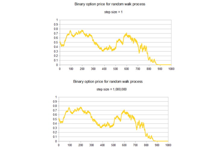 At the beginning of the game, our chance of winning is 50/50. The graphs below show how that chance would unfold through time for a given sequence of coin-flips. On the left we assume a bet amount of $1; on the right $1 million. But apart from the caption, the graphs are exactly the same. In both cases, swings in probability from 20 percent to 80 percent are not unlikely at all.