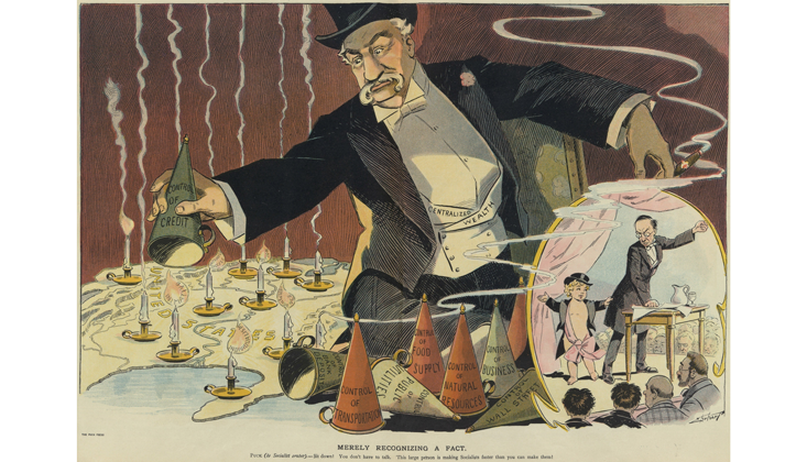 Philanthropists were also drawn to dinosaurs as a powerful tool to help naturalize the evolution of American capitalism. Before the Civil War, the business landscape of the U.S. was dominated by small, family-owned firms that specialized in a single product or service. But that changed dramatically during the last third of the 19th century, as sole proprietorships were increasingly replaced by large, capital-intensive, and often vertically integrated corporate firms. As these corporate behemoths gobbled up their competitors in a wave of mergers and acquisitions, some grew so large that they threatened to monopolize an entire industrial sector. This restructuring of America’s political economy elicited enormous controversy, especially among rural populations who found themselves on the receiving end of the bureaucratic machine.