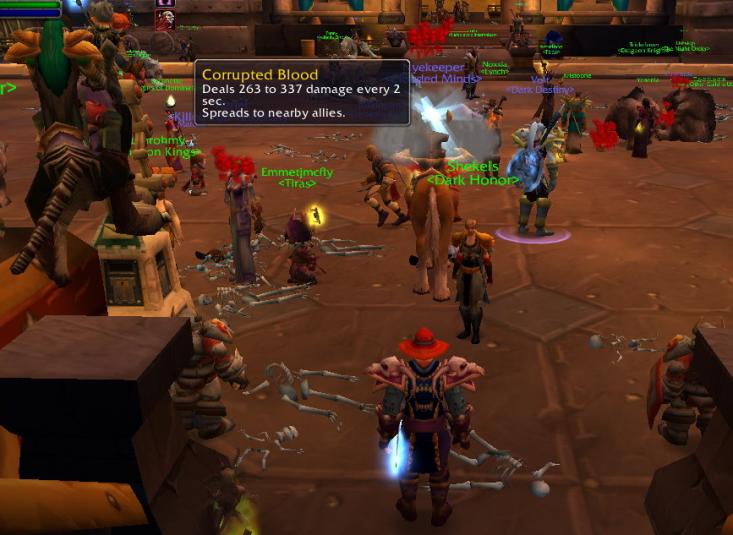 What made things worse was that teleportation is most commonly used to get to cities—big capitals where players can buy and sell items, and one of the few places where high- and low-level players meet and interact. So when infected characters teleported from Zul’Gurub to Ironforge or Orgrimmar, Corrupted Blood came with them. Within a few hours, Ironforge was full of skeletons and characters wandering around, dazed and spurting blood.