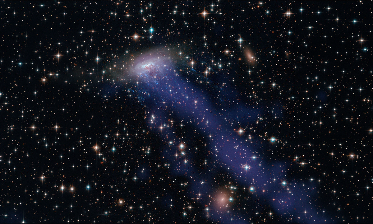 Roberts and his colleagues spotted the farthest jellyfish galaxy seen to date: COSMOS2020-635829, whose distance indicates a view of the universe 8.5 billion years ago. COSMOS2020-635829 looks relatively symmetrical, but with a southward-facing tail. Analyses indicated that the tail consisted of ionized gases and contained a series of bright blue knots that can be interpreted as young stars formed outside of the main galaxy.