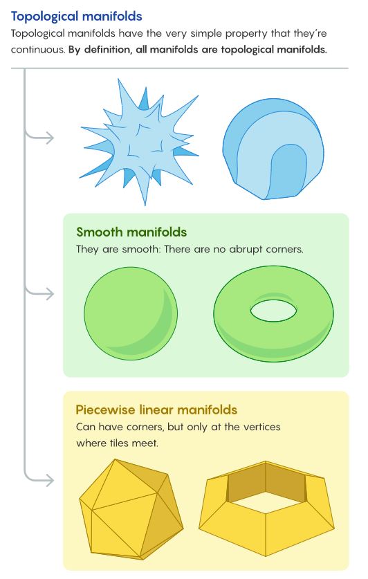 The third type of manifold has a complexity in between the bare-bones topological manifolds and the more highly structured smooth ones. It’s called a piecewise linear manifold, and it helps to imagine it made up of polygon-like tiles. Piecewise linear manifolds can have corners, just like topological ones, but the piecewise structure restricts where those corners can occur: only at the vertices where tiles meet.