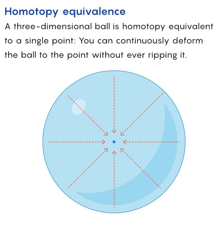 By this loose standard, many shapes that look nothing alike are considered the same: A three-dimensional ball (like a baseball) is homotopy equivalent to a single point, because you can continuously deform the ball down to a point without ever ripping it. However, a doughnut is not homotopy equivalent to a point because of the hole in its center, which can’t be done away with no matter how tightly you shrink it.