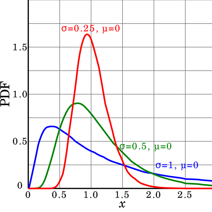 The ideal wage income distribution is log-normal. The shape of the log-normal distribution is completely determined by specifying its parameters, mu (μ) and sigma (σ). These depend on a country’s minimum income, maximum income, and average income. So, the first step is to calculate these parameters for the different countries—of course, they’re not the same. Here, for example, is what three lognormal distributions look like with the same mu, but different sigmas.