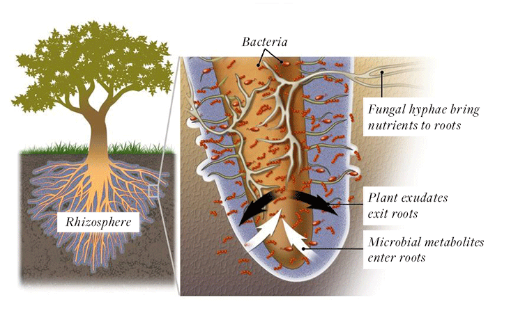 As you can see, the rhizosphere is the place for microbes and plants to carry on the nutrient transfers and chemical signaling that forms the foundation for their symbiotic relationship. Plants are not giving away the farm. They get a lot in return.