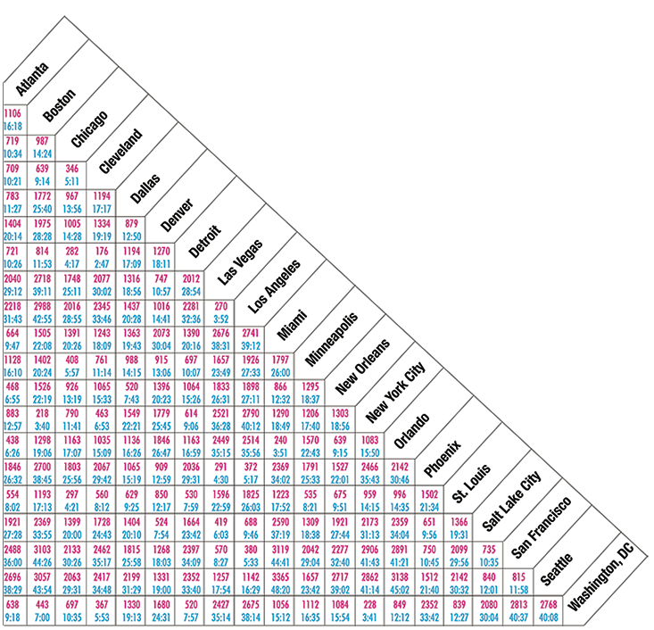 Suppose you have 20 cities. The chart contains 400 numbers. To fill in the data, a map company such as AAA hires drivers to travel from city to city and jot down the odometer mileage or take GPS readings. In terms of real information content, the chart is highly redundant. The distances obey very specific rules that mathematicians call “distance axioms.” To begin with, the 20 numbers running along the diagonal are zero—the distance from each city to itself. Of the remaining numbers, half are repeats, since distances are symmetrical: A car driving from Dallas to Salt Lake City covers basically the same ground as a car going the other way. Indeed, most map companies leave off this redundant information and show only the remaining triangle of numbers.