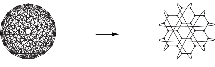 The links between the elementary grains are as simple as can be. Two grains are either connected to each other or not, like Facebook users who can either be friends or not—just an on-or-off relationship. The resulting network looks like a string-art craft project in which you hammer nails (representing the grains) into a sheet of wood and stretch threads (the links) among some of them. Despite the simplicity of its construction, the network can take on a huge variety of shapes, ranging from skeletal outlines to elaborate mandalas.